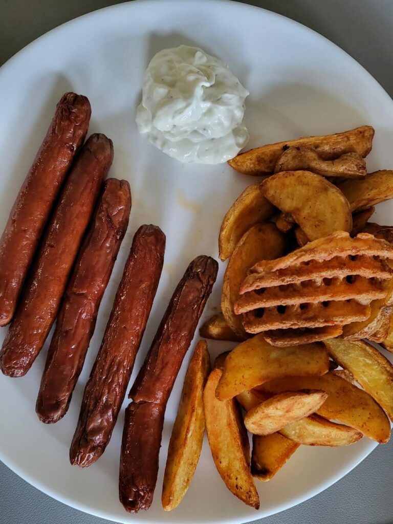 Mein Gott, was für eine Ernährung heute … Würstchen und Kartoffelecken.