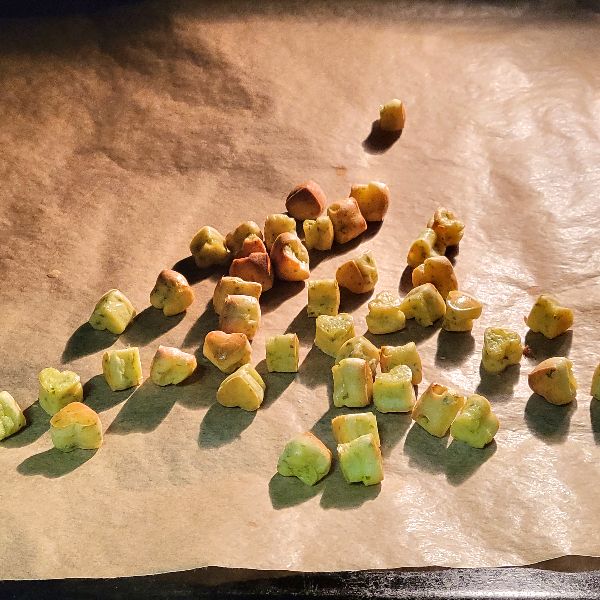 Den Teig auf ein mit Backpapier belegtes Blech streichen, backen und anschließend in kleine Würfel schneiden. Nach dem Schneiden eventuell noch mal etwas nachtrocknen (bei 50 °C und leicht geöffneter Ofentür).
