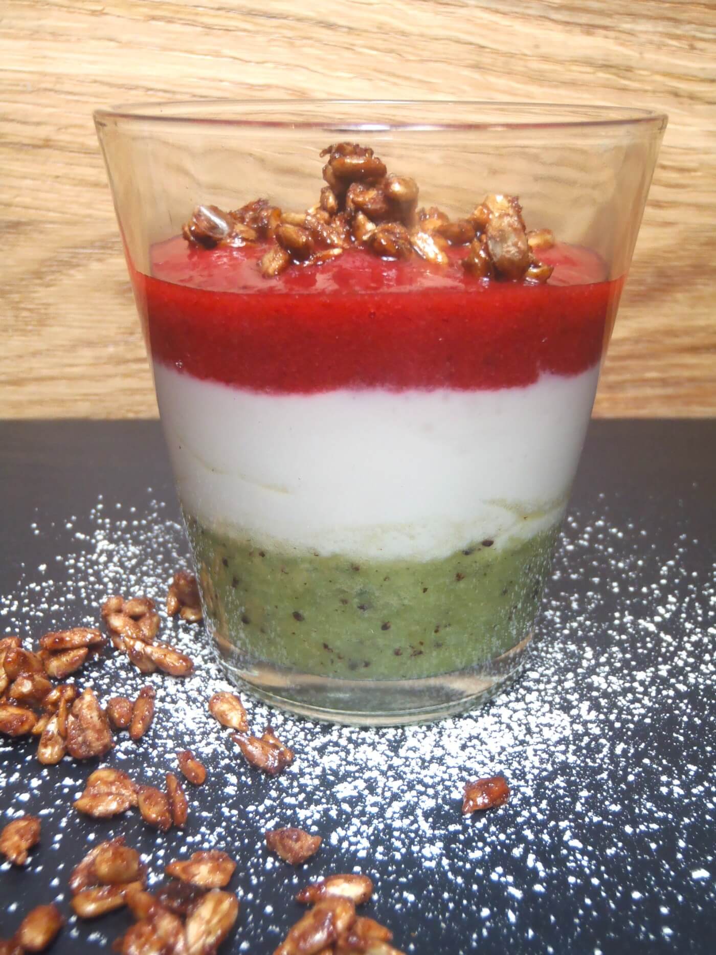 - Abschließend kannst du ein Topping auf das Dessert geben. Ich habe gebrannte Sonnenblumenkerne auf dem Dessert, aber herrlich schmeckt auch geraspelte Schokolade oder ganz besonders: gehacktes Baiser!