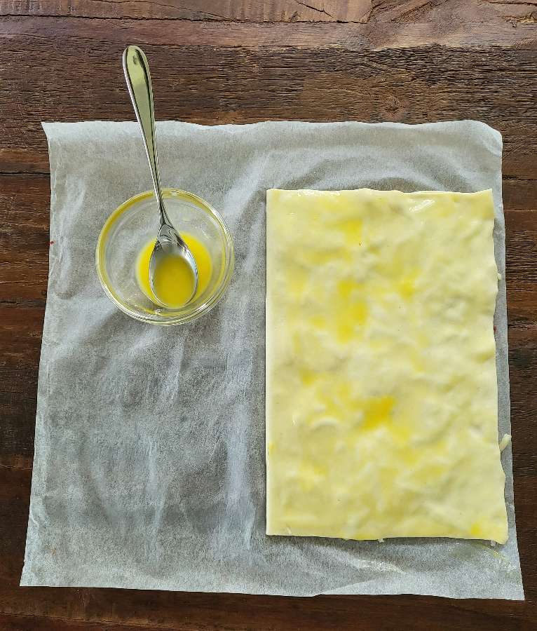 - Teig „ruhen“ lassen: Blätterteig aus dem Kühlregal sollte nach dem Auspacken ein paar Minuten bei Raumtemperatur liegen, damit er sich leichter verarbeiten lässt, sollte aber nicht zu warm werden.