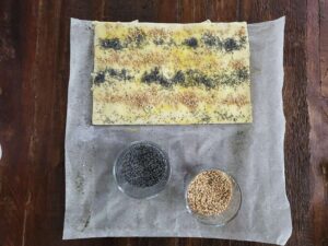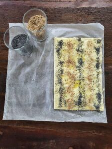 - Das Backpapier über die mit Mohn und Sesam bestreute Seite legen, den Teig umdrehen und das Backpapier vorsichtig lösen.