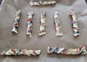 - Die Enden jedes Streifens ca. viermal in die entgegengesetzten Richtungen drehen. So entstehen gedrehte Stangen.
