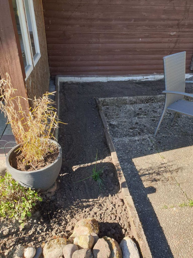 Dem ersten Akt folgten dann noch der zweite mit dem Titel: das Unkraut und das Gras muss weg und dem dritten, den ich meinem Rücken widme, da ich die Waschkies-Platten anhob und so das Beet um eine Plattenbreite vergrößerte. Wer hätte gedacht, dass ein wenig Beton mit ein paar Kieseln so schwer sein kann. Die Mitte des dritten Akts sah ungefähr so aus: