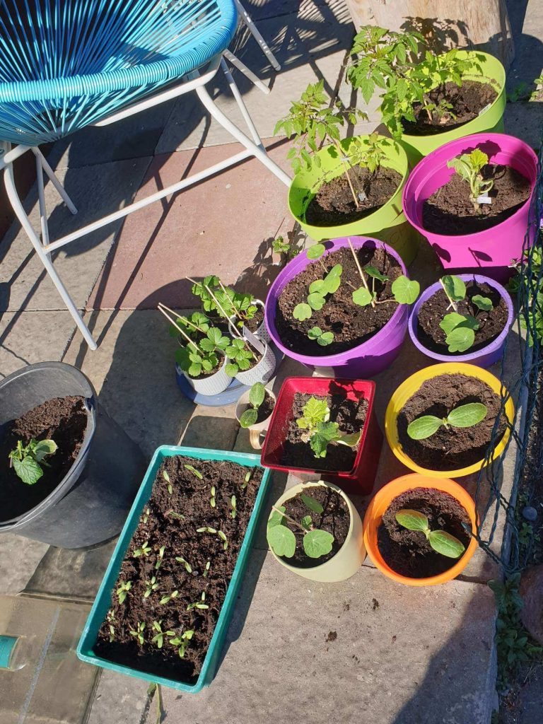 Ich warte jetzt bis die Eisheiligen vorbei sind und dann kann ich meine Pflanzen ins Beet setzten. Ich ziehe gerade Kapuzinerkresse, Zucchini, Kletter-Erdbeeren, Mangold, Tomaten und Gurken groß. Allerdings verbleiben die Tomaten und die Gurken auf der Terrasse, wo sie vor Regen geschützt sind – sofern es dieses Jahr überhaupt regnet. Wir liegen hier schon drei Wochen auf dem trockenen.