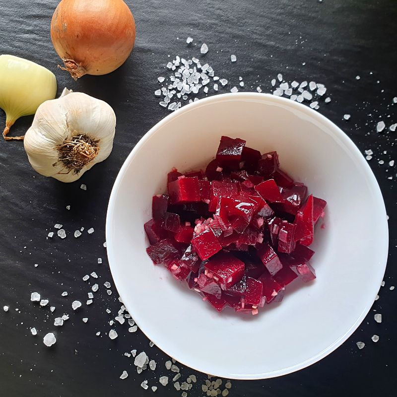 Heute möchte ich dir ein Rezept vorstellen, das mir besonders gut gefällt: mein Rote Bete Salat. Dieser Salat verbindet Einfachheit und Raffinesse. Die leuchtend rote Farbe der Bete macht den Salat nicht nur zu einem echten Hingucker auf jedem Tisch, sondern verspricht auch einen Genuss für den Gaumen. Was diesen Salat so besonders macht, ist die Kombination aus der leicht süßlichen Note der Roten Bete, der scharfen Frische der Zwiebeln und dem Kick des Knoblauchs. Alles wird durch ein simples, aber schmackhaftes Dressing aus Rapsöl, weißem Balsamico, Salz und Pfeffer zusammengehalten. Ob als leichte Hauptmahlzeit an warmen Tagen oder als Beilage zu einem herzhaften Gericht im Winter – dieser Salat ist vielseitig einsetzbar und bringt immer einen Hauch von Farbe und Geschmack auf den Teller. Lasst uns gemeinsam eintauchen in die Welt dieses köstlichen und gesunden Gericht.