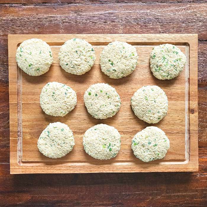 - Den Teig in 10 Teile teilen und daraus ca. 1 cm dicke Frikadellen formen