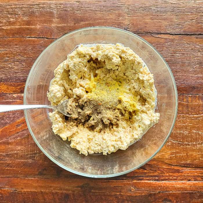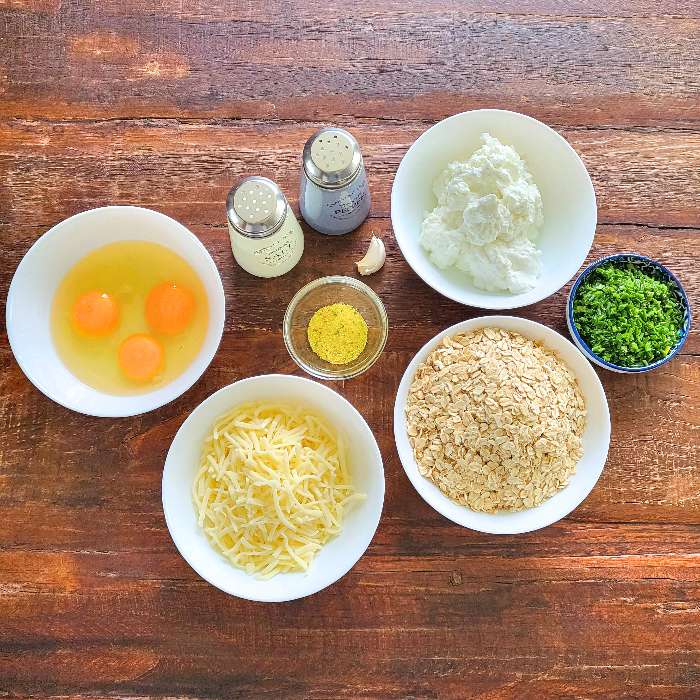 - 200 Gramm Haferflocken, 250 Gramm Quark, 100 Gramm Emmentaler und die 3 Eier in eine Schüssel geben und vermengen.