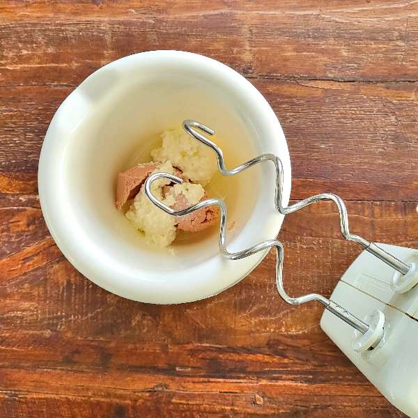 60 Gramm Leberwurst, 75 Gramm Hüttenkäse und 2 EL Rapsöl in eine Rührschüssel geben.